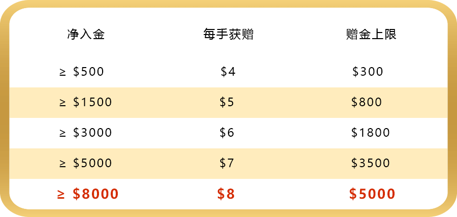 活动期间,已激活客户完成净入金后,可联系客服报名参与;报名成功后, 交易现货黄金、原油、全部指数类产品,可依照报名当下活动层级,获得对应奖励