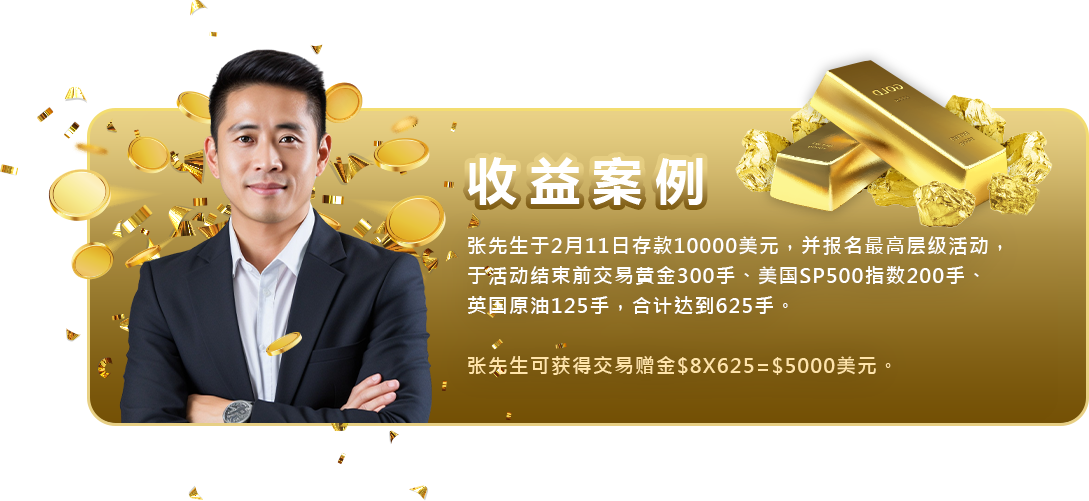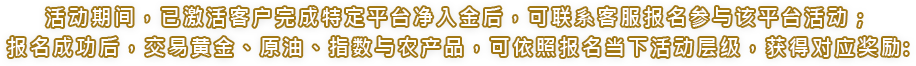 活动期间,已激活客户完成特定平台净入金后,可联系客服报名参与该平台活动;报名成功后,交易黄金、原油、指数与农产品,可依照报名当下活动层级,获得对应奖励: