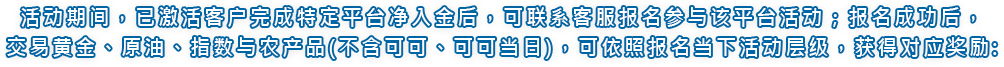 活动期间,已激活客户完成特定平台净入金后,可联系客服报名参与该平台活动;报名成功后,交易黄金、原油、指数与农产品(不含可可、可可(当日)),可依照报名当下活动层级,获得对应奖励:
