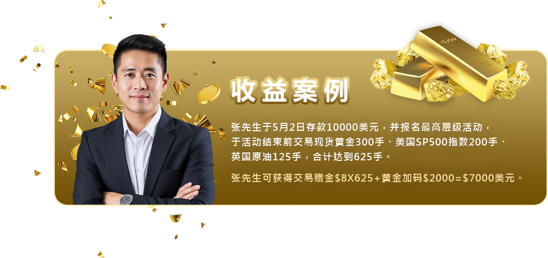 黄金加码:活动中交易黄金相关产品,除原有层级返赠,额外加码每手8美元,上限2000美元赠金。